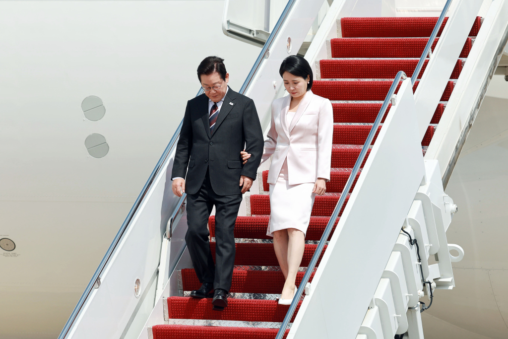 当地时间8月24日下午,李在明偕夫人金惠景乘机抵达华盛顿近郊的安德鲁斯联合基地,美国国务院礼宾司副司长艾比·琼斯戴着墨镜上前迎接握手,美空军上校约书亚·金送上一枚纪念硬币,李在明看了一眼之后便放进了西装口袋,礼仪安排相对简单。