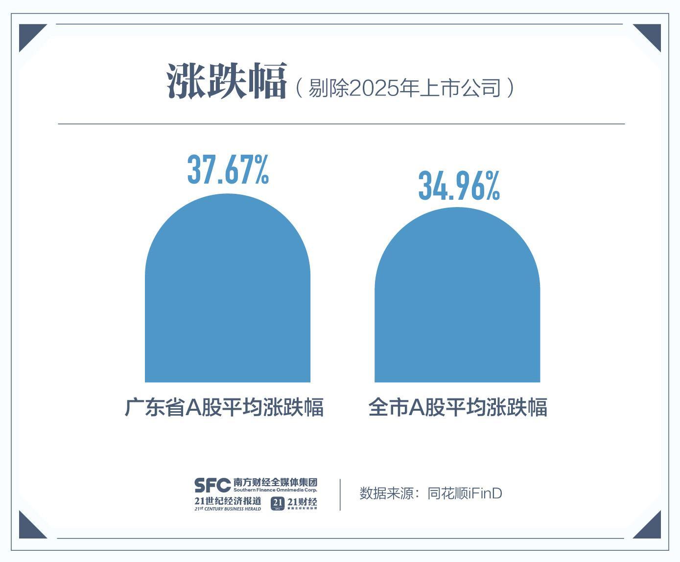 在这样的行情中,广东A股上市公司表现出众。个股平均涨跌幅(前复权,剔除2025年上市公司)达37.67%,而全部A股整体涨跌幅(前复权,剔除2025年上市公司)为34.96%,广东A股平均涨幅高出全部A股2.71个百分点,跑赢大市。