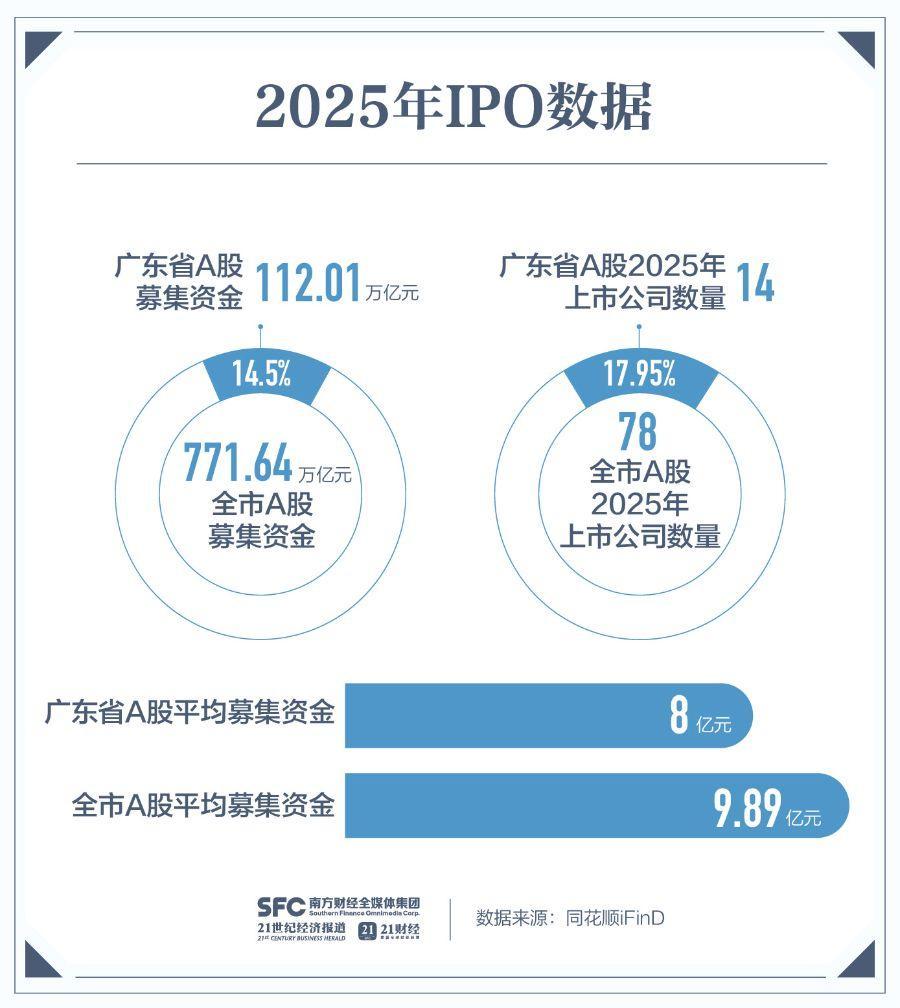 在此大背景下,广东省2025年的新股发行表现同样可圈可点。从发行数量与全国占比来看,2025年广东省新增14家A股上市公司,占全年A股新上市公司总数的17.9%。值得注意的是,这一占比超过了广东现有A股上市公司在全国的占比(17.2%)。有市场人士向记者分析指出,这一数据反映出广东优质企业的上市“供给能力”正持续提升,源源不断地为资本市场注入新鲜活力。