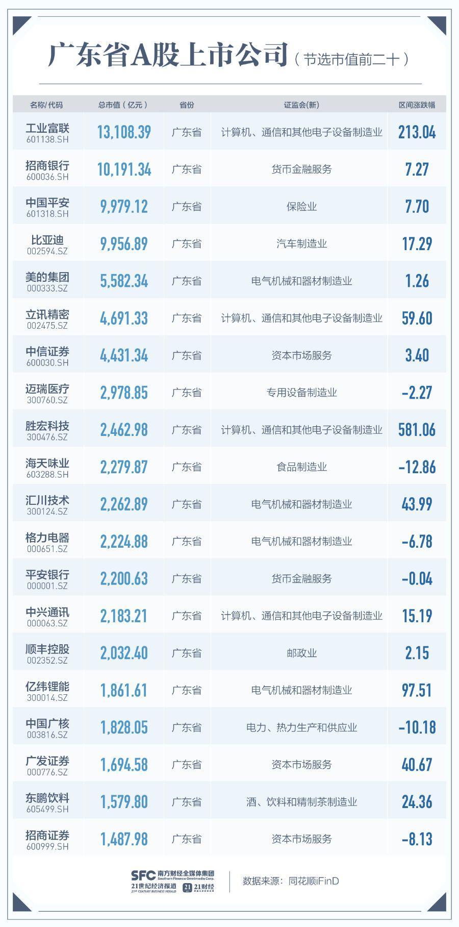 进一步拆解头部企业阵容,广东A股的“龙头效应”尤为突出。市值排名前五的企业均为各自行业的领军者:其中,AI服务器行业龙头工业富联(601138.SH),其13108.386亿元的总市值不仅位居广东A股榜首,在全部A股中也跻身前十大市值企业行列。截至9月30日,年内涨幅(前复权)达213.04%。
