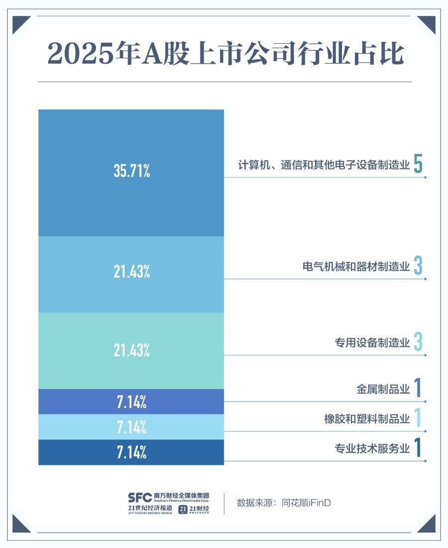 聚焦行业分布,计算机、通信和其他电子设备制造业成为广东年内上市新股最为集中的领域。该领域上市企业数量达到5家,占广东省2025年上市公司总数的35.71%。众多企业在品牌消费电子、半导体材料、电子化学品Ⅲ、被动元件、光学元件等细分行业各展身手。以影石创新(688775.SH)为例,其专注于品牌消费电子领域,在智能影像设备市场中崭露头角。