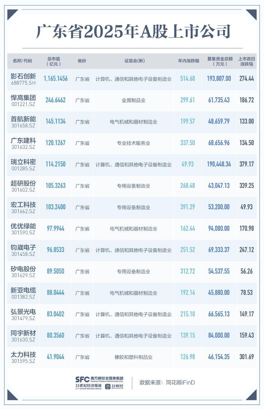 在募资规模与结构方面,广东省2025年新上市的14家公司合计募集资金112.01亿元,占全年A股募资总额的14.5%。不过,平均每家新上市公司募集资金8亿元,略低于全部A股9.89亿元的平均水平。在这14家企业中,影石创新募资总额最高,达19.38亿元。作为一家专注于智能影像设备的企业,影石创新的核心产品涵盖运动相机、VR全景相机、专业级影像设备等,展现出强大的产品研发与市场拓展能力。截至9月30日,影石创新上市后股价累计上涨59.65%,显示出良好的市场表现。